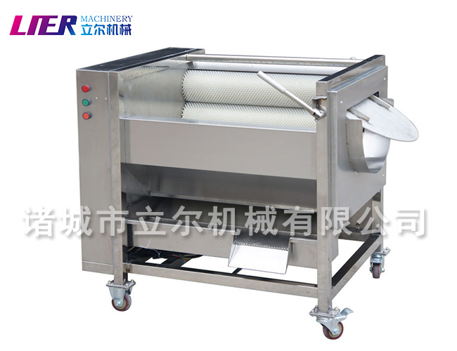 當原料放入該機后,毛刷輥旋轉刷洗原料并使其不斷翻轉,同時,排水管不斷地噴淋,把從原料上刷洗下來的污物沖洗掉,直到洗凈為止,順著毛輥的旋轉方向出料。